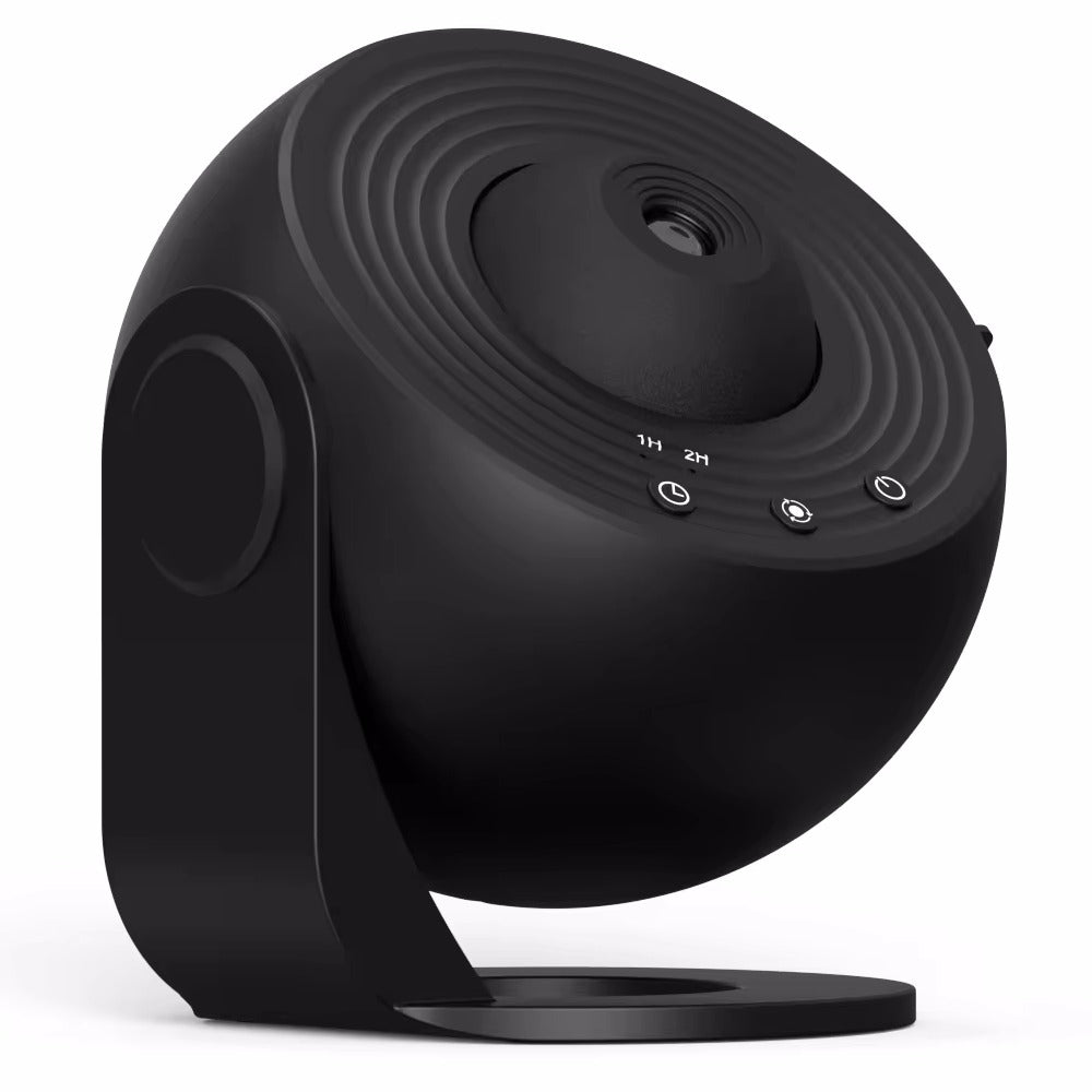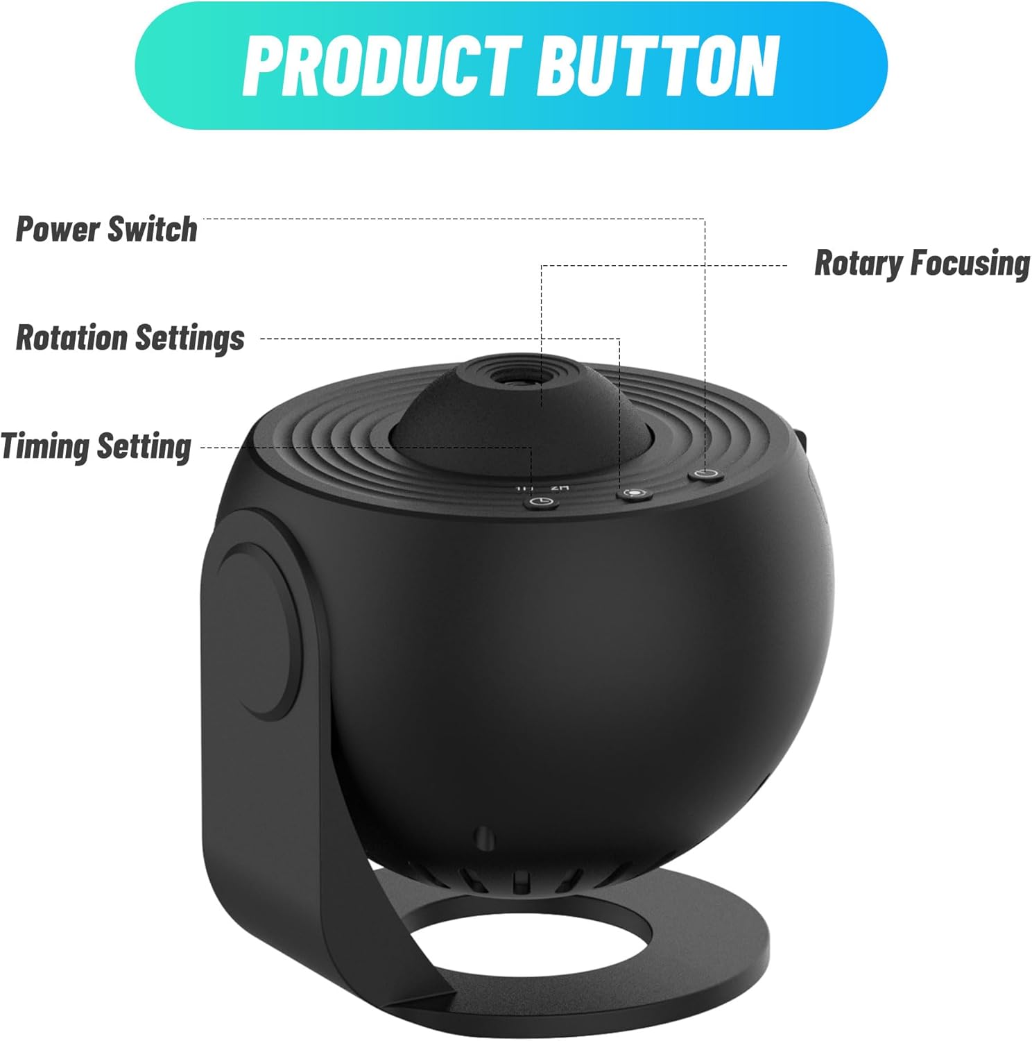 The visual clearly highlights the product's compact, sleek form factor and the essential accessories that make it easy to use: a multifunctional remote control for seamless switching between the 13 galaxy slides, adjusting rotation, and setting the timer. Also visible is the USB-C port, confirming the modern, hassle-free power source that ensures continuous, high-definition projection without the worry of dead batteries.